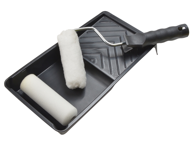 This Stanley mini paint roller kit includes one roller head for emulsion and one roller head for gloss or varnish. The practical size tray can be held in the hand whilst using the roller. The hollow handle in roller frame allows the use of an extension pole.
