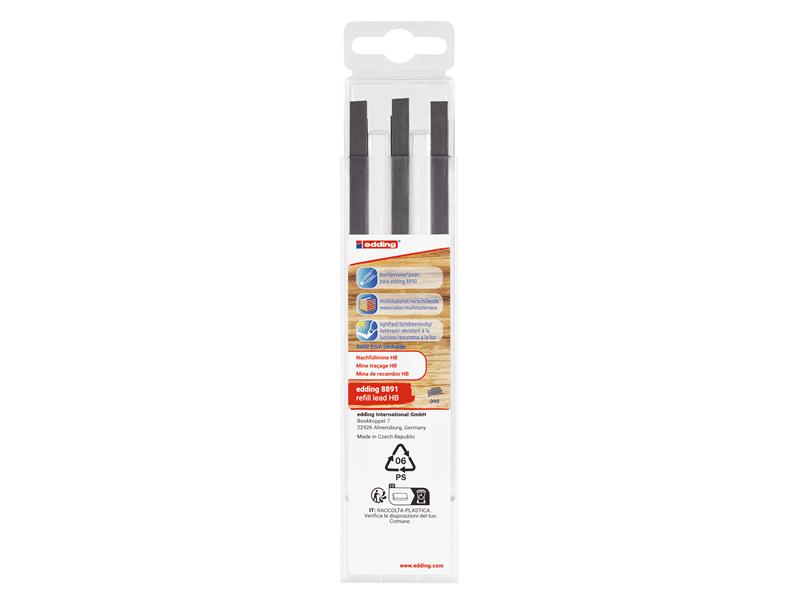 edding 8891 Refill HB Lead Set for the edding 8890 Mechanical Carpenter Pencil. For reliable markings on hard and rough materials like wood, stone, concrete or bricks. The rectangular lead prevents breaking and can be easily sharpened with the help of sand paper or a hard stone.