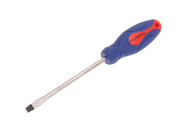 The FAISDF150 Slotted Flared Soft Grip Screwdriver has the following specifications: Type: Flared Tip. Tip: 8mm. Length: 150mm (6in).