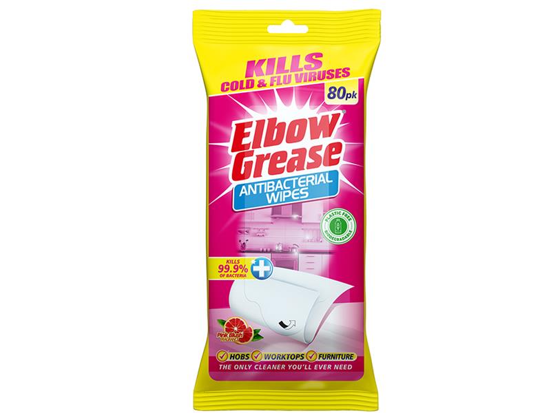 £1.86 £1.40 excl. VAT £1.68 inc. VATElbow Grease® Antibacterial Wipes are perfect for use anywhere around the home. Their strong cleaning action eliminates dirt and grime from any hard surface, leaving your home or office hygienically clean for longer. The handy resealable pack allows easy storage and offers a practical and convenient way in which to clean